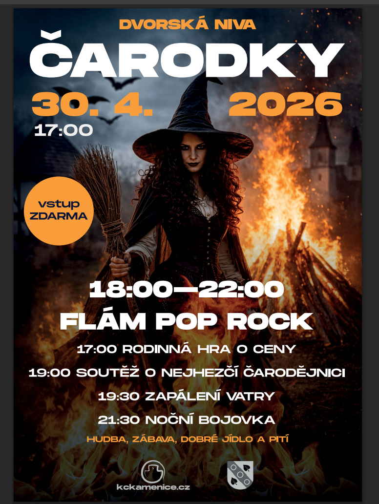 Rok se s rokem sešel a poslední dubnová noc bude opět ve znamení magie, mystična a pálení ohňů. Připravte si piknikové deky, pohodlné oblečení, dobrou náladu a přijďte v 17:00 hodin do Dvorské nivy oslavit čarodky. Těšit se můžete na hry, zábavu, suprovou muziku a dobré jídlo a pití.