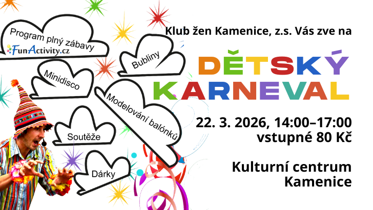 Klub žen Kamenice zve Vás a Vaše děti na dětský karneval a suprové odpoledne s hudbou, tancem a show šaška Vikiho.